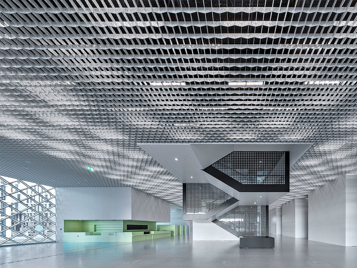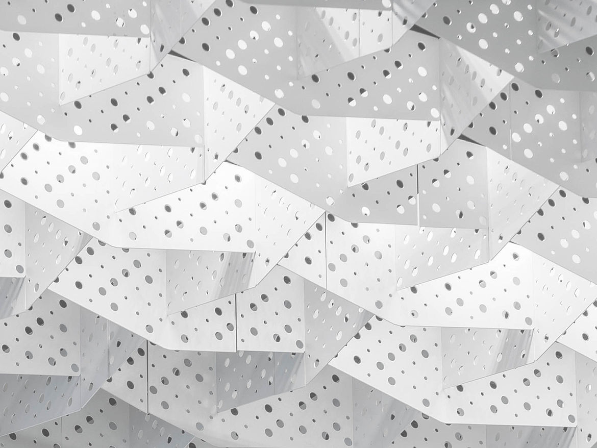 La disposition des lames ondulées et posées en quinconce confère au plafond multidirectionnel QUADRA-DECOR son caractère moderne et aérien. La perforation irrégulière des lames soutient la diffusion de la lumière.